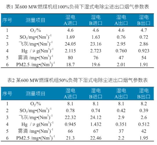 針對(duì)某600MW燃煤機(jī)組工程化應(yīng)用在100%負(fù)荷及50%負(fù)荷條件下進(jìn)行了測(cè)試,測(cè)試結(jié)果詳見(jiàn)表1和表2,出口煙塵濃度均滿足設(shè)計(jì)值,也大大低于超低排放標(biāo)準(zhǔn),同時(shí)濕電對(duì)三氧化硫、汞及霧滴的協(xié)同脫除作用也非常明顯。