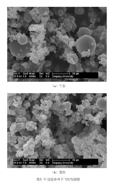 此外,還對(duì)濕態(tài)與干態(tài)條件下進(jìn)口處粉塵形貌變化進(jìn)行了表征。采用電子顯微鏡拍攝,放大倍率均為5000倍,采用鍍鋅片作為顆粒物的載體,可清晰觀測(cè)到10μm左右顆粒物形態(tài)。從圖3中可看出,在濕態(tài)狀態(tài)下,大顆粒物明顯減少,細(xì)顆粒物團(tuán)聚增強(qiáng),且顆粒邊緣清晰度降低。由此可見(jiàn),液滴對(duì)10μm及以下的顆粒物具有一定的清洗作用,同時(shí)對(duì)細(xì)顆粒物具有團(tuán)聚的作用。