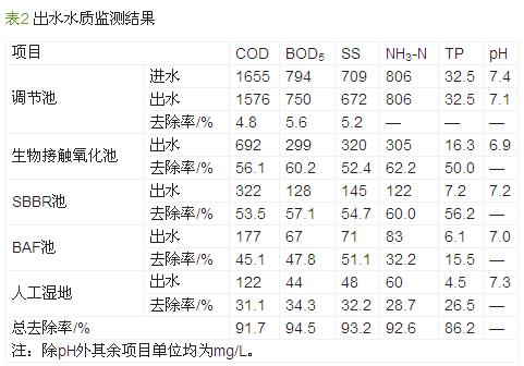 由于豬場沼液的碳氮比低,可生化性差,不適合微生物生長,故定時向廢水中添加一定量的營養(yǎng)物,以提高B/C。系統(tǒng)運行至今,各單元處理效果穩(wěn)定,經(jīng)生物接觸氧化、SBBR、BAF、人工濕地處理后,出水水質(zhì)可滿足《畜禽養(yǎng)殖業(yè)污染物排放標準》(GB 18596—2001)中的相關(guān)要求,監(jiān)測結(jié)果見表2。