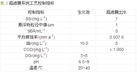 超濾膜采用德國BERGHOF膜組件,膜道8 mm,膜孔30 nm。經(jīng)生化處理后的含油廢水由進水泵打入超濾膜系統(tǒng),膜系統(tǒng)產(chǎn)水經(jīng)轉(zhuǎn)子流量計計量后排入凈水罐,部分濃水回流至生化系統(tǒng),部分濃水由循環(huán)泵與進水混合重新進入超濾膜〔7〕。超濾膜處理系統(tǒng)流程見圖 3。工藝控制指標見表 3。